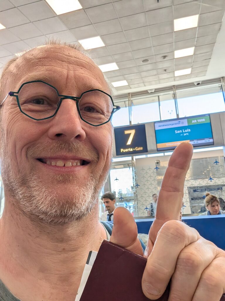 Je volais vers San Luis en soirée depuis Aeroparque, aéroport plus proche du centre et décidai donc d’aller faire mon blog dans un bar de l’av. de Mayo au centre pour me laisser encore un peu imprégner des effluves envoûtantes de la capitale. Vers 16h16 (environ) je me rends compte que je vole à 18h30 et que je suis toujours au centre, que je dois rentrer à l’hôtel dans le quartier de Monserrat en bordure de San Telmo (pour les connaisseurs) pour chercher mon bagage et aller à l’aéroport faire mon check-in. Petit moment de stress très.. — comment dire — très moi (ouf, ce n’est pas Moscou et je ne vais pas à Bangkok, close joke). Uber, hôtel, bouchons, aéroport et bim! check-in effectué à 17h. La tension retombe.