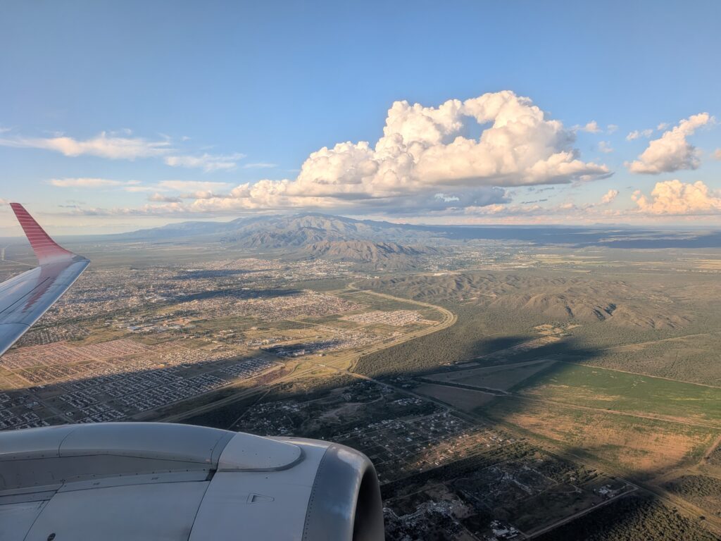 Et me voilà à l’aéroport avec mon comité de femmes accompagnantes, les mêmes qu’à l’arrivée. Embarquement et vue dégagée de San Luis au décollage. La Sierra, la ville, Juana Koslay, El Potrero, El Volcán, Villa de la Quebrada, La Punta tout y est. Même les Comechigones à l’horizon (une Sierra escarpée qui sépare la Province de San Luis de Córdoba.