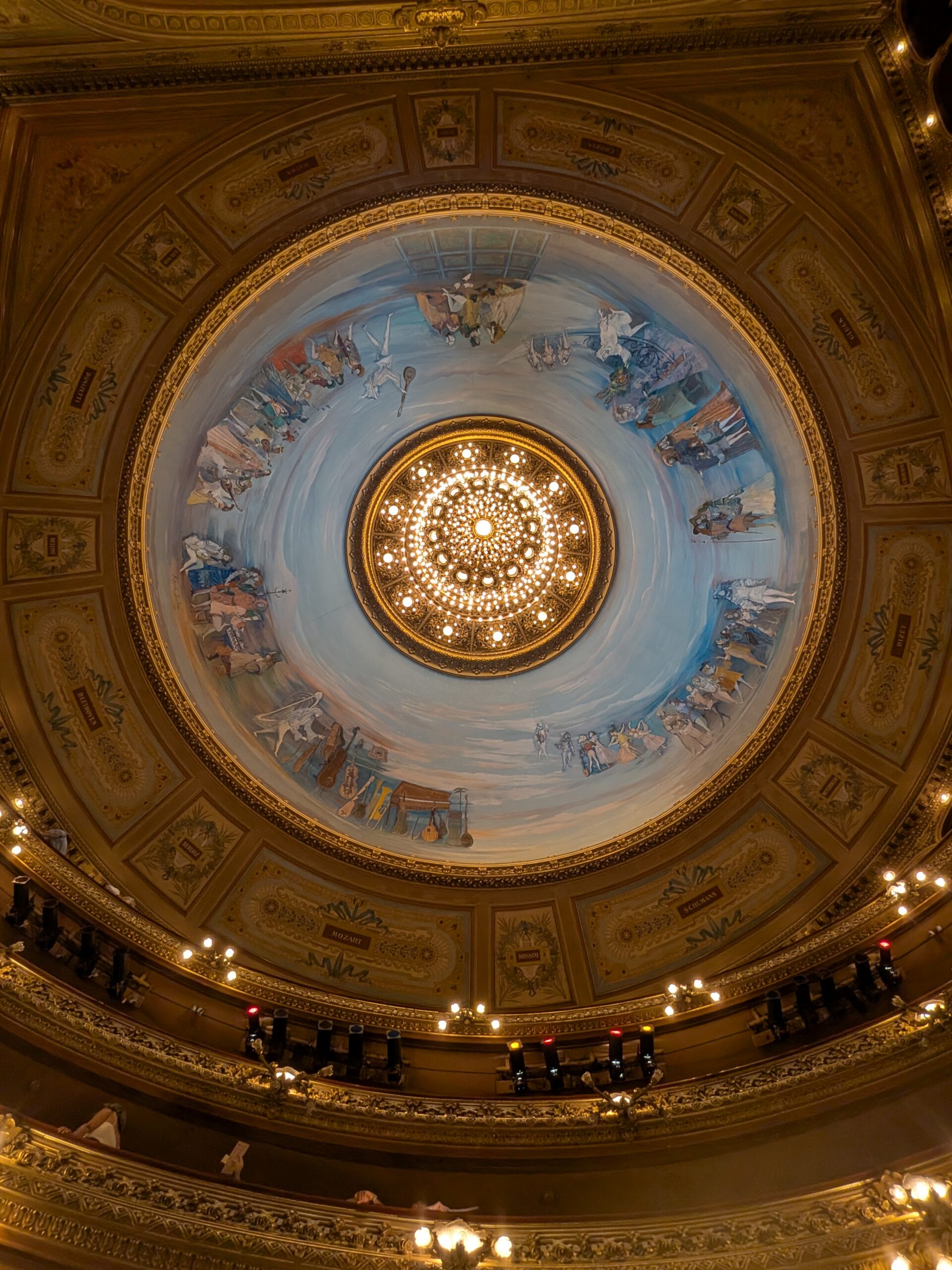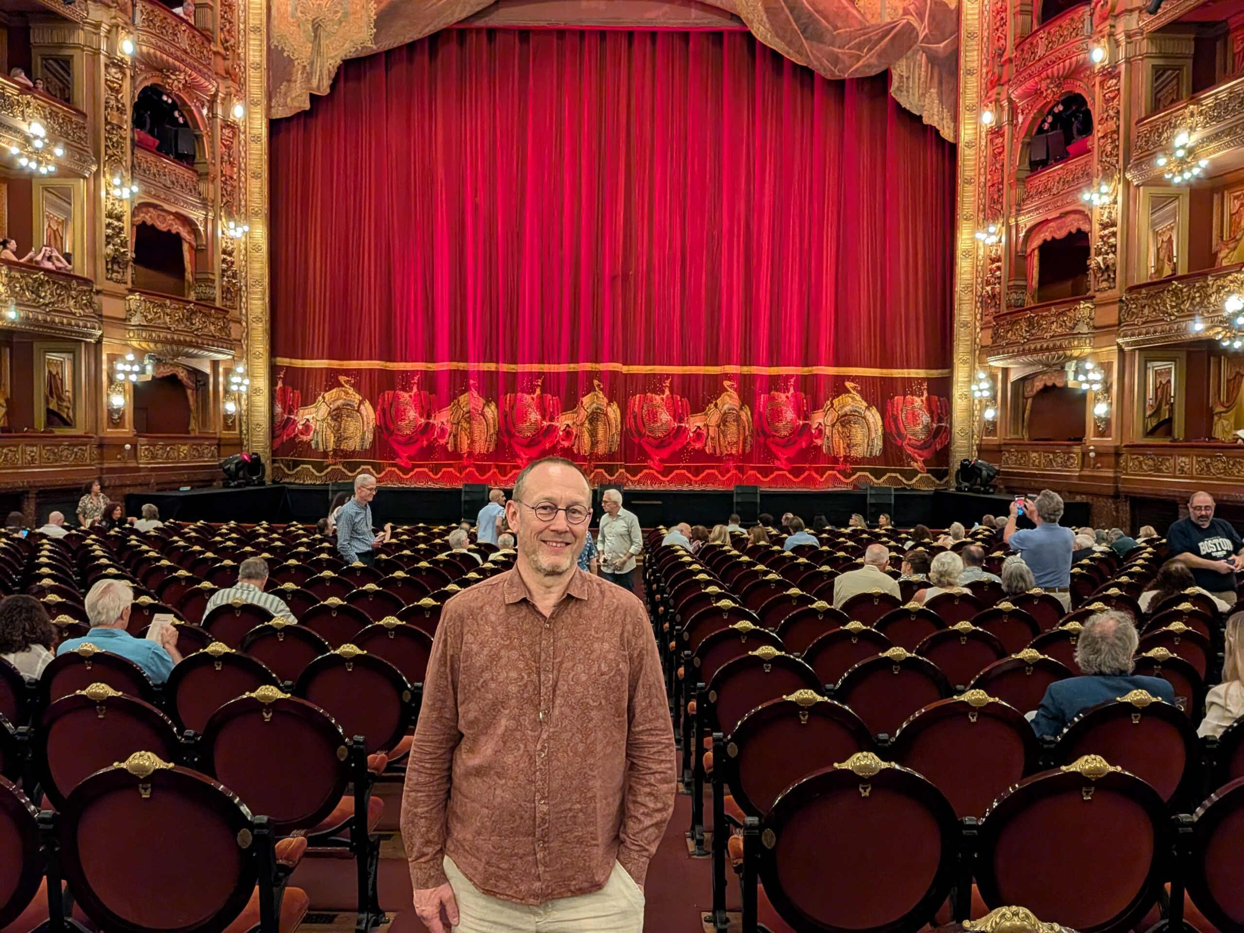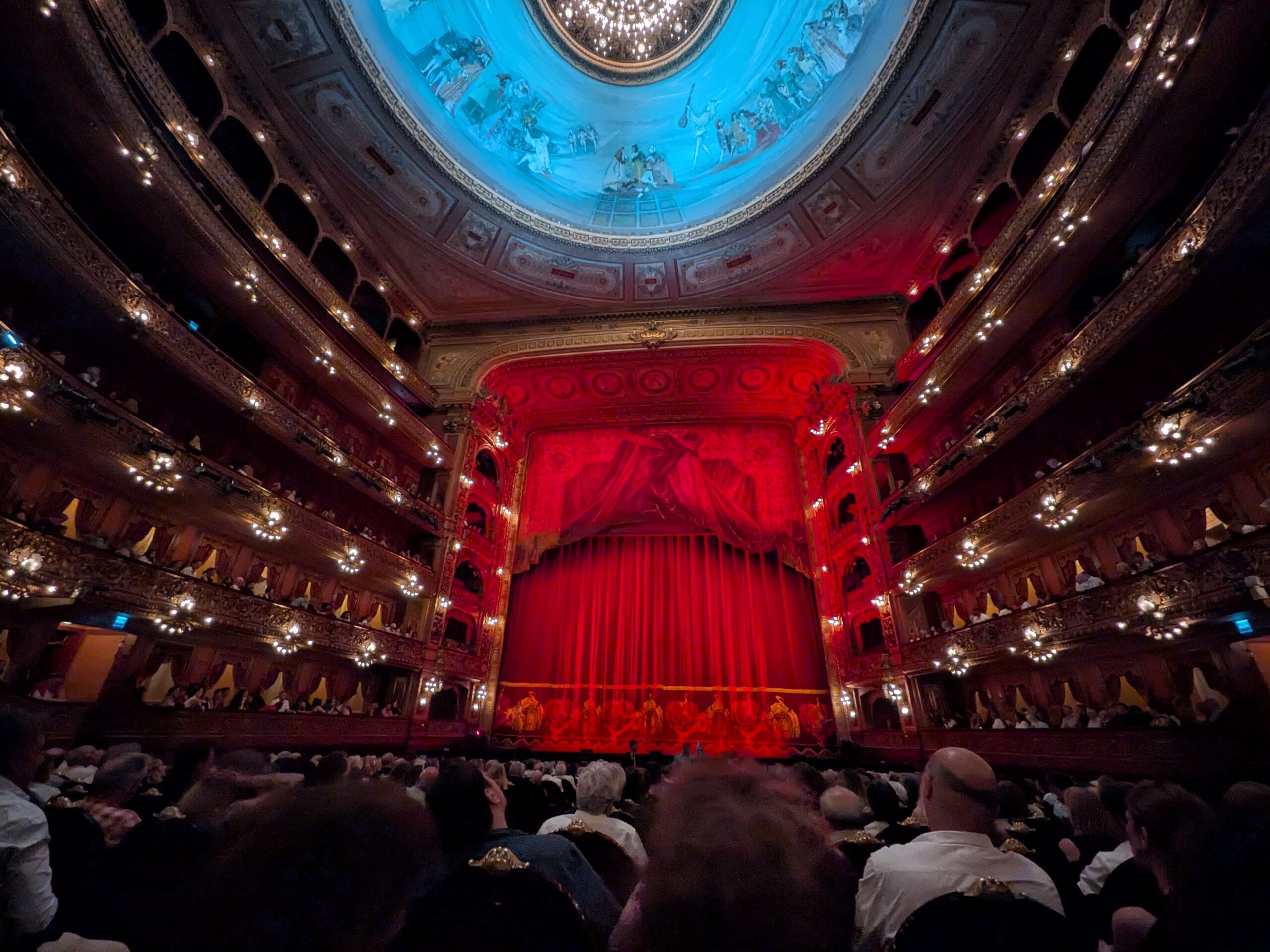 Déjà le théâtre est fantastique. Très grand théâtre à l’italienne, avec un hall énorme où les portes sont ouvertes par des portiers en livrée et en perruques. Un décorum désuet dans un écrin de majesté.